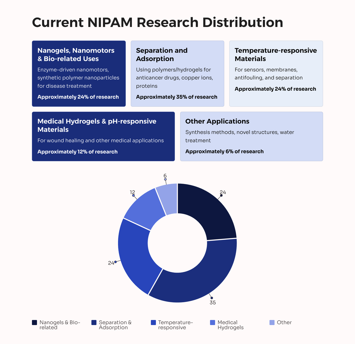 These findings indicate that NIPAM is primarily applied in biomedical and biofunctional nanomaterials, with active research also underway in temperature-responsive sensors and membrane technologies.