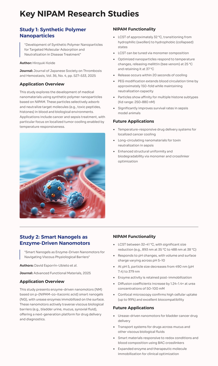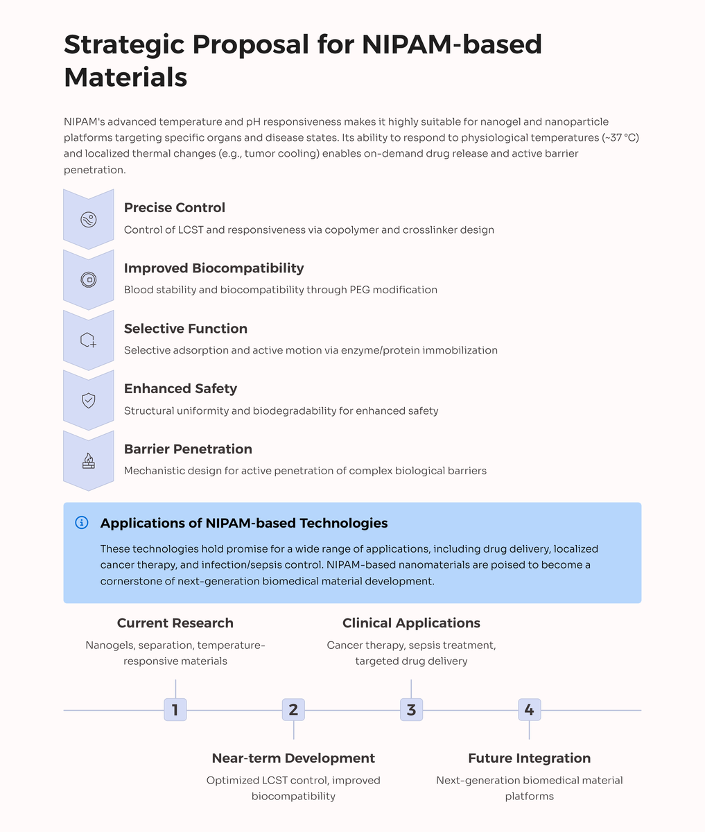 NIPAM’s advanced temperature and pH responsiveness makes it highly suitable for nanogel and nanoparticle platforms targeting specific organs and disease states. Its ability to respond to physiological temperatures (~37 °C) and localized thermal changes (e.g., tumor cooling) enables on-demand drug release and active barrier penetration.